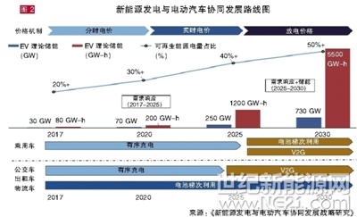 值得注意的是,《報告》發(fā)布了新能源發(fā)電與電動汽車協(xié)同發(fā)展路線圖(如圖2)?!叭鐖D所示,可再生能源發(fā)電量占比將從目前25%提升至50%以上,電動汽車儲能理論潛力也將從目前的30GW-100GWh提升至700GW-3800GWh?!眲詮娬{(diào),在不同時段引入合理的價格機制和并網(wǎng)模式是發(fā)掘電動汽車儲能潛力的關(guān)鍵。