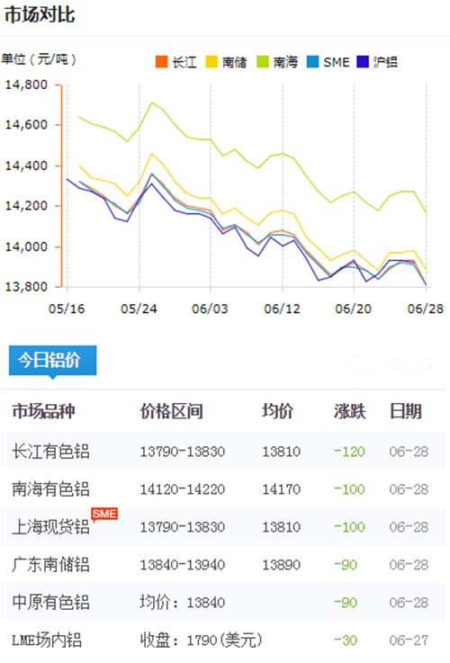 鋁錠價(jià)格今日鋁價(jià)2019-06-28