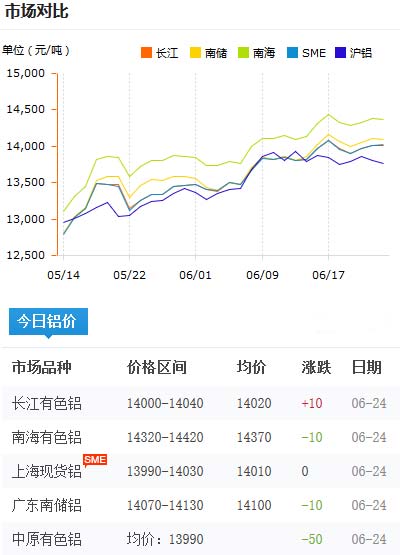 鋁錠價(jià)格今日鋁價(jià)2020-06-24